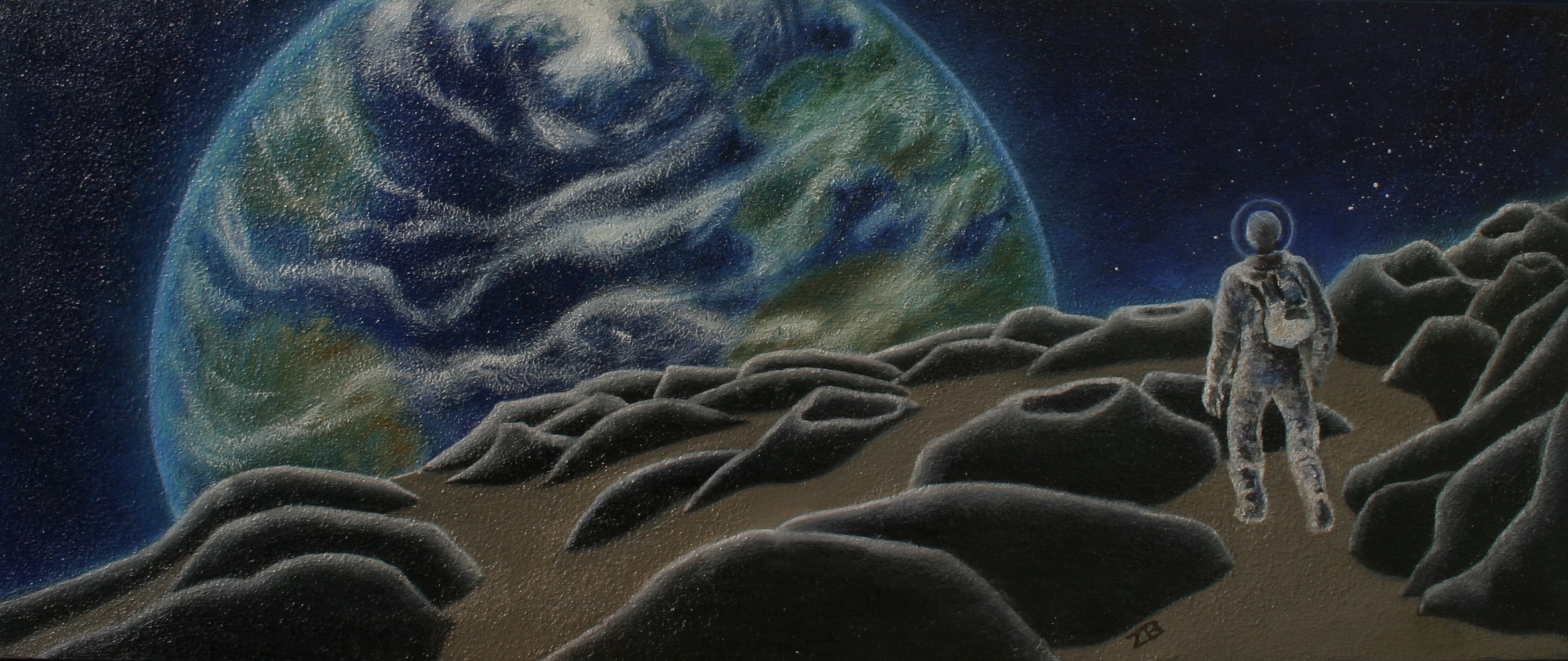 Apprensione e malinconia del proprio pianeta. olio su legno 23.6x44.5 cm. Anno 2018.