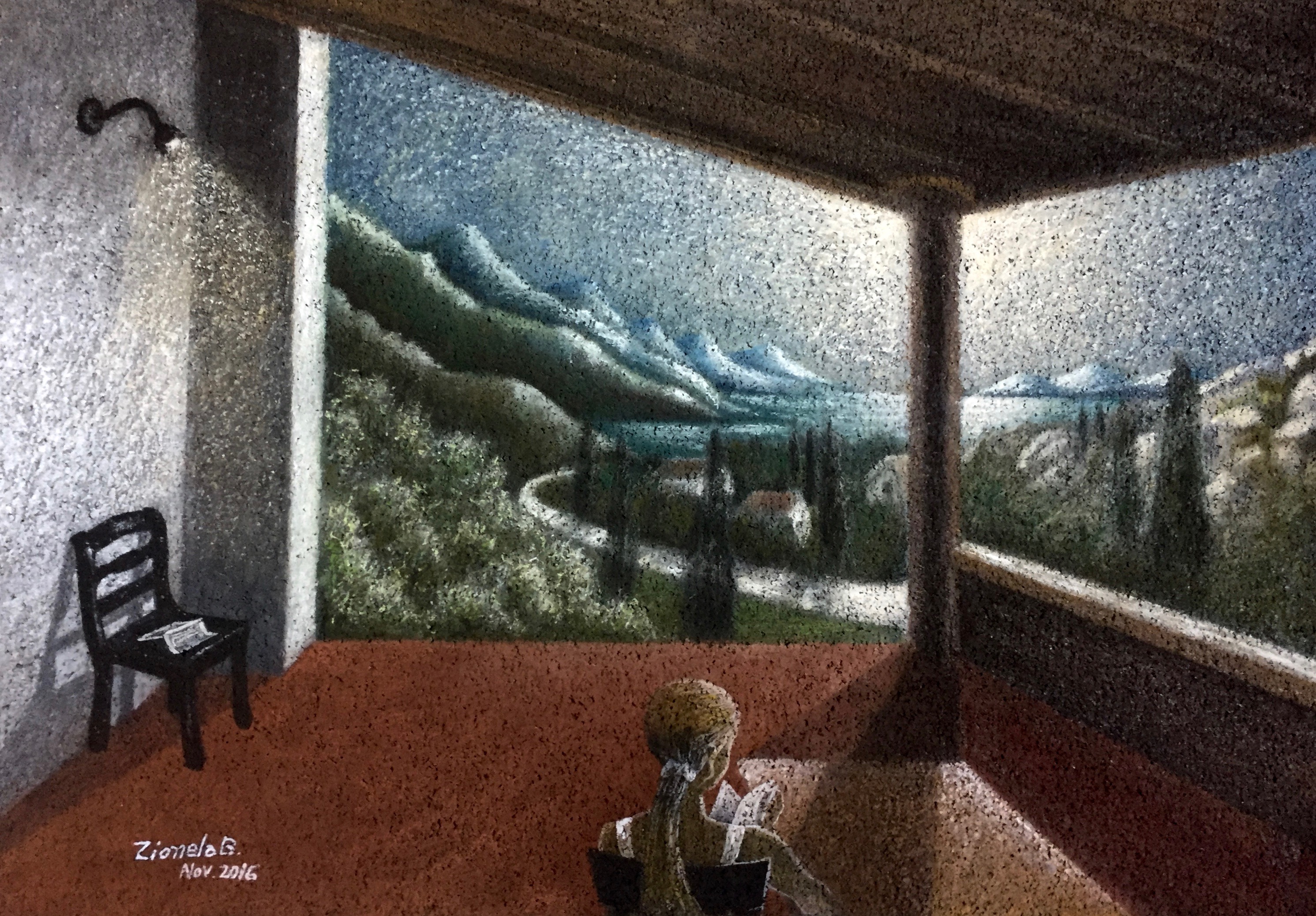L’osservatore da una finestra guarda la luna e la sua luce riflessa nel fiume. E il secondo dipinto della serie “Luoghi davanti”.