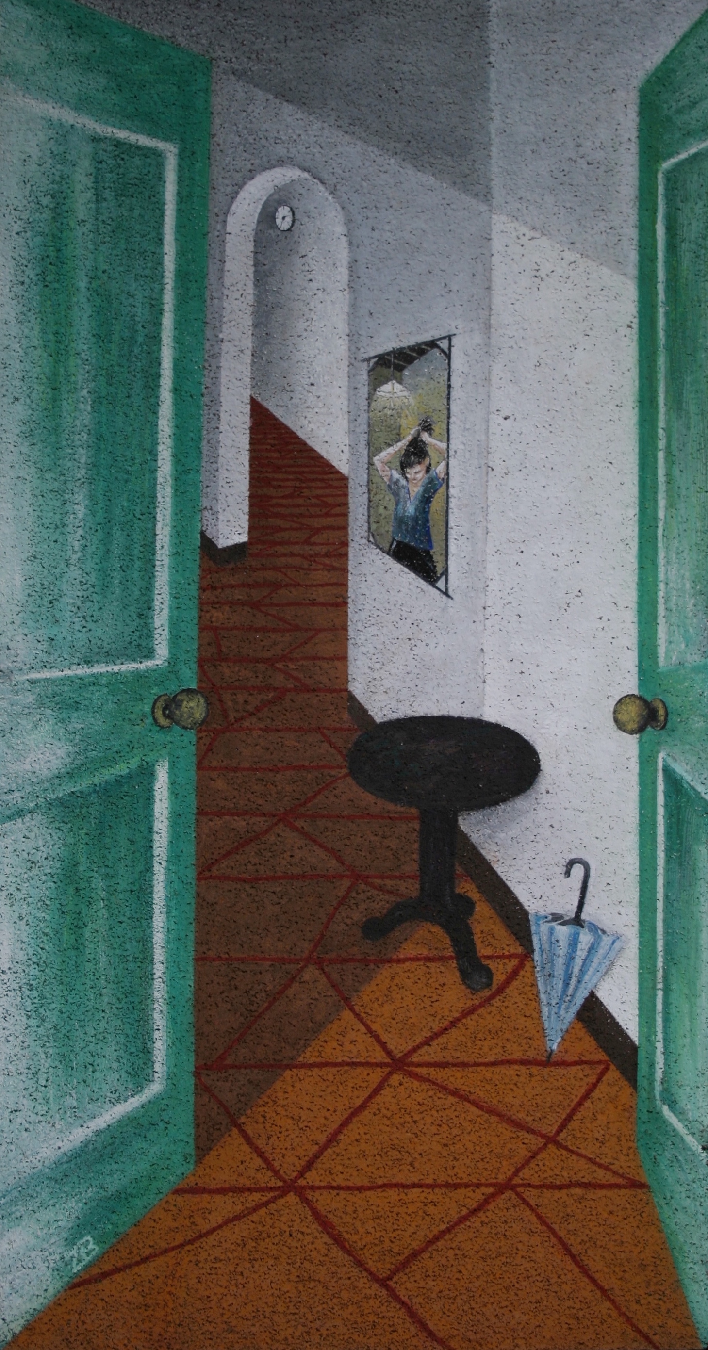 L’interno di una casa attraversata da un corridoio, con lei che da dietro la porta si sistema i capelli e con l’orologio che indica che bisogna andare.