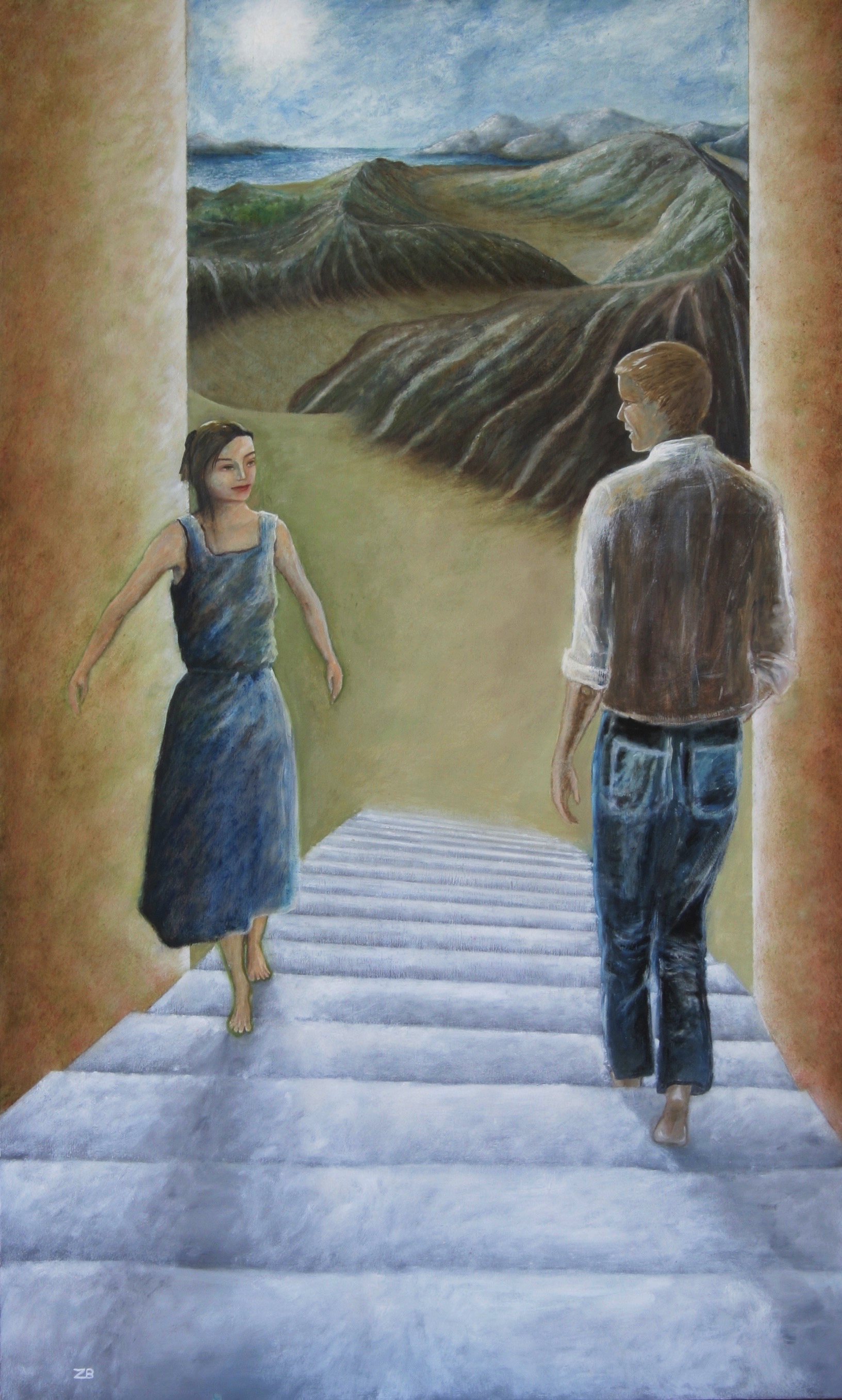 A man comes down from a ladder in the foreground and a woman goes up; she is coming out of the planet while he is coming. It is the beginning and the end of a path, it represents the movement, the intersection and the relationship between beings.