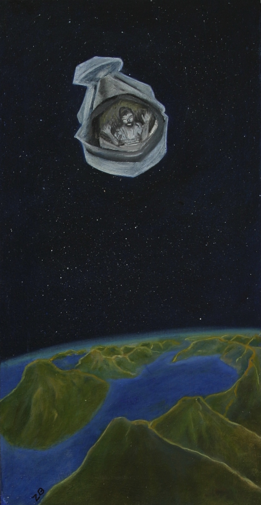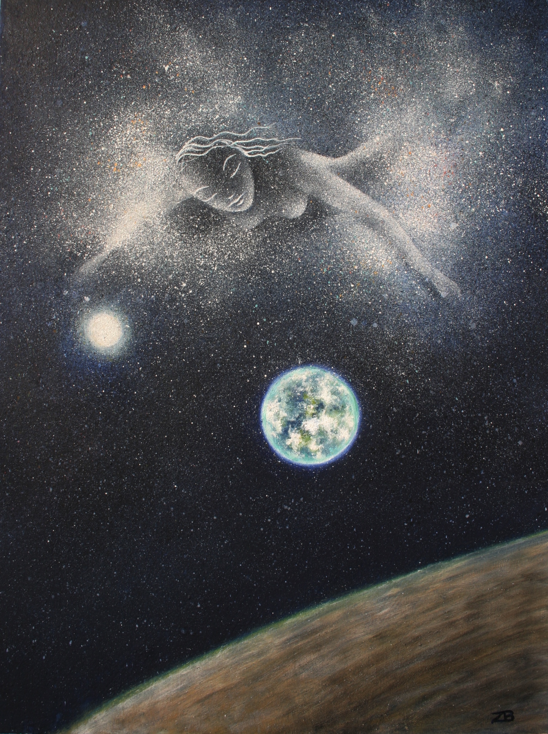 Third painting in the Milky Way series, our galaxy with the shape of a woman to signify that it carries us as a mother carries her children in her womb.