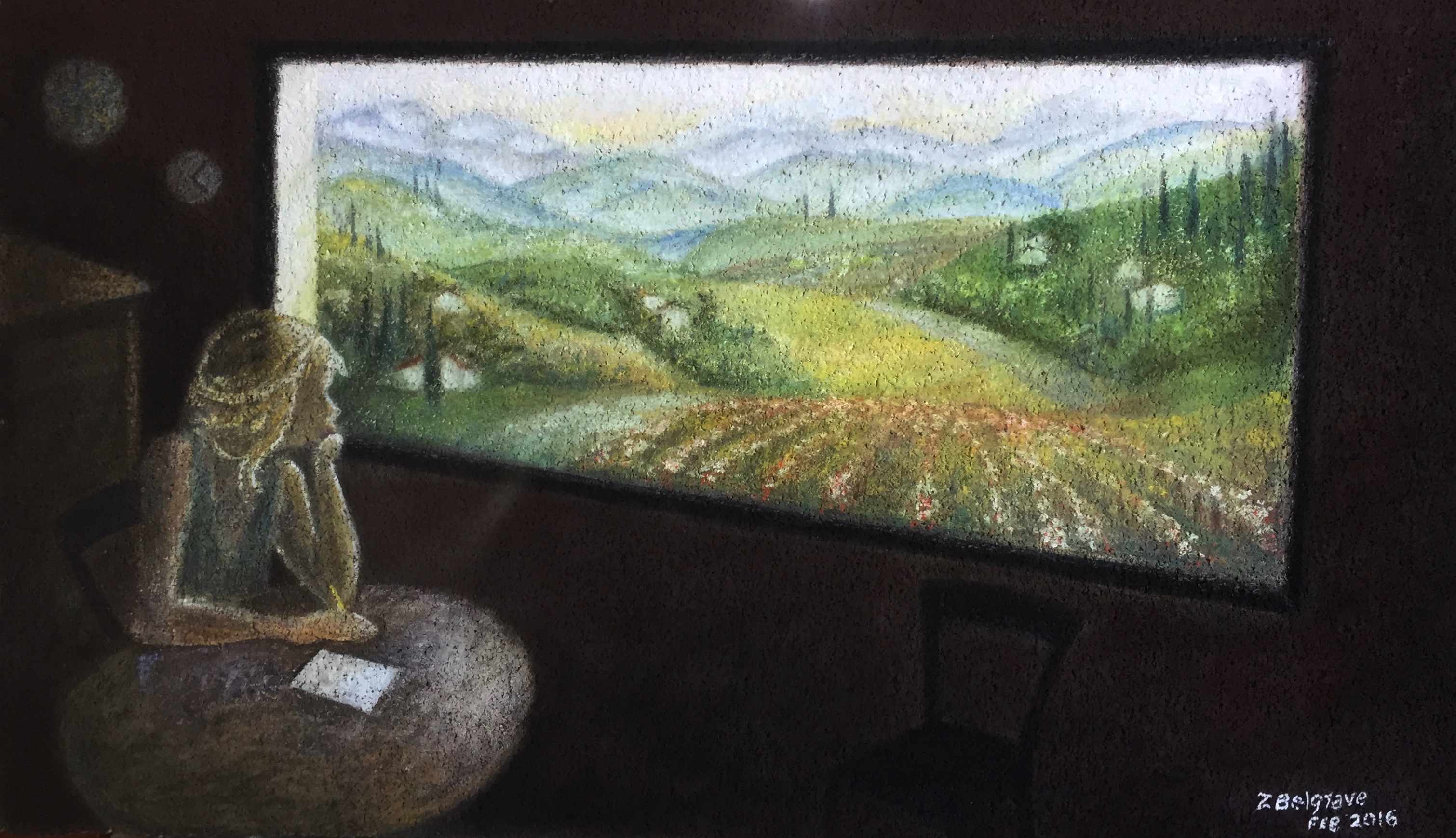 Intende scrivere un biglietto e pensa come farlo mentre guarda il paesaggio.