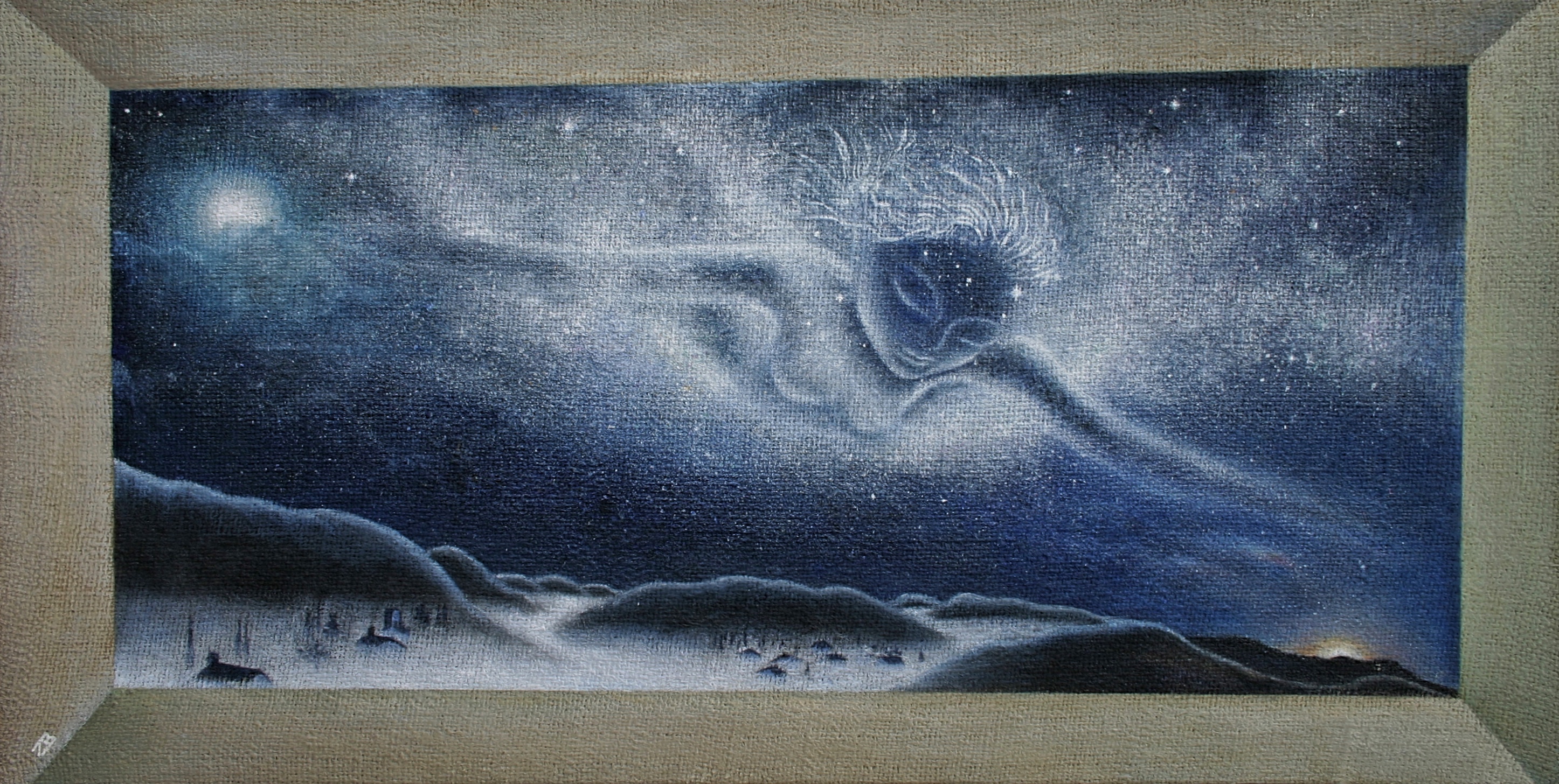 Apprensione e malinconia del proprio pianeta. olio su legno 23.6x44.5 cm. Anno 2018.
