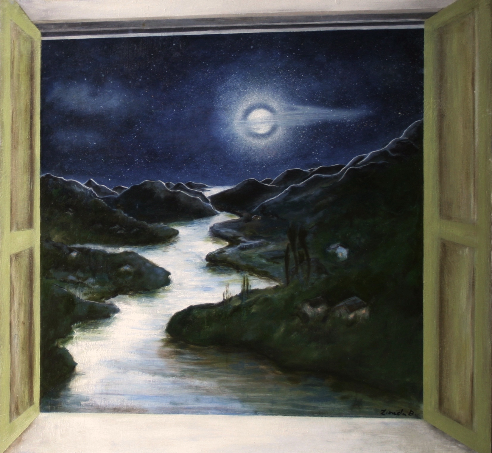L’osservatore da una finestra guarda la luna e la sua luce riflessa nel fiume. E il secondo dipinto della serie “Luoghi davanti”.